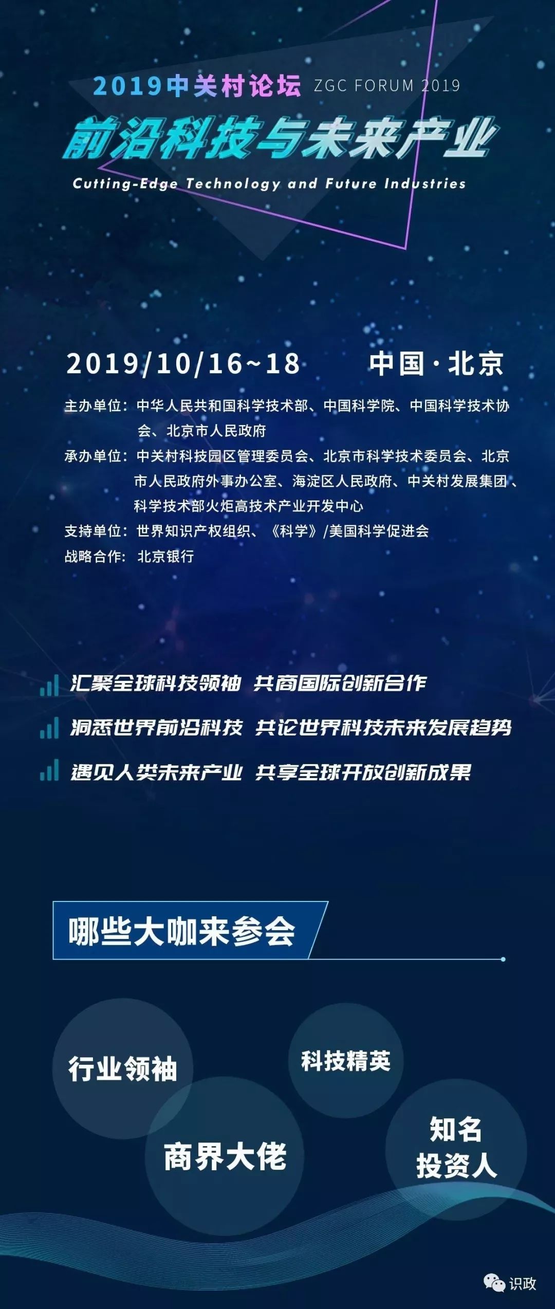 10月17日上午,2019中關村論壇在京開幕。市委書記蔡奇宣讀習近平主席賀信并致辭,科技部部長王志剛,中國科學院院長白春禮,中國科學技術協會黨組書記、常務副主席、書記處第一書記懷進鵬致辭,市人大常委會主任李偉出席。