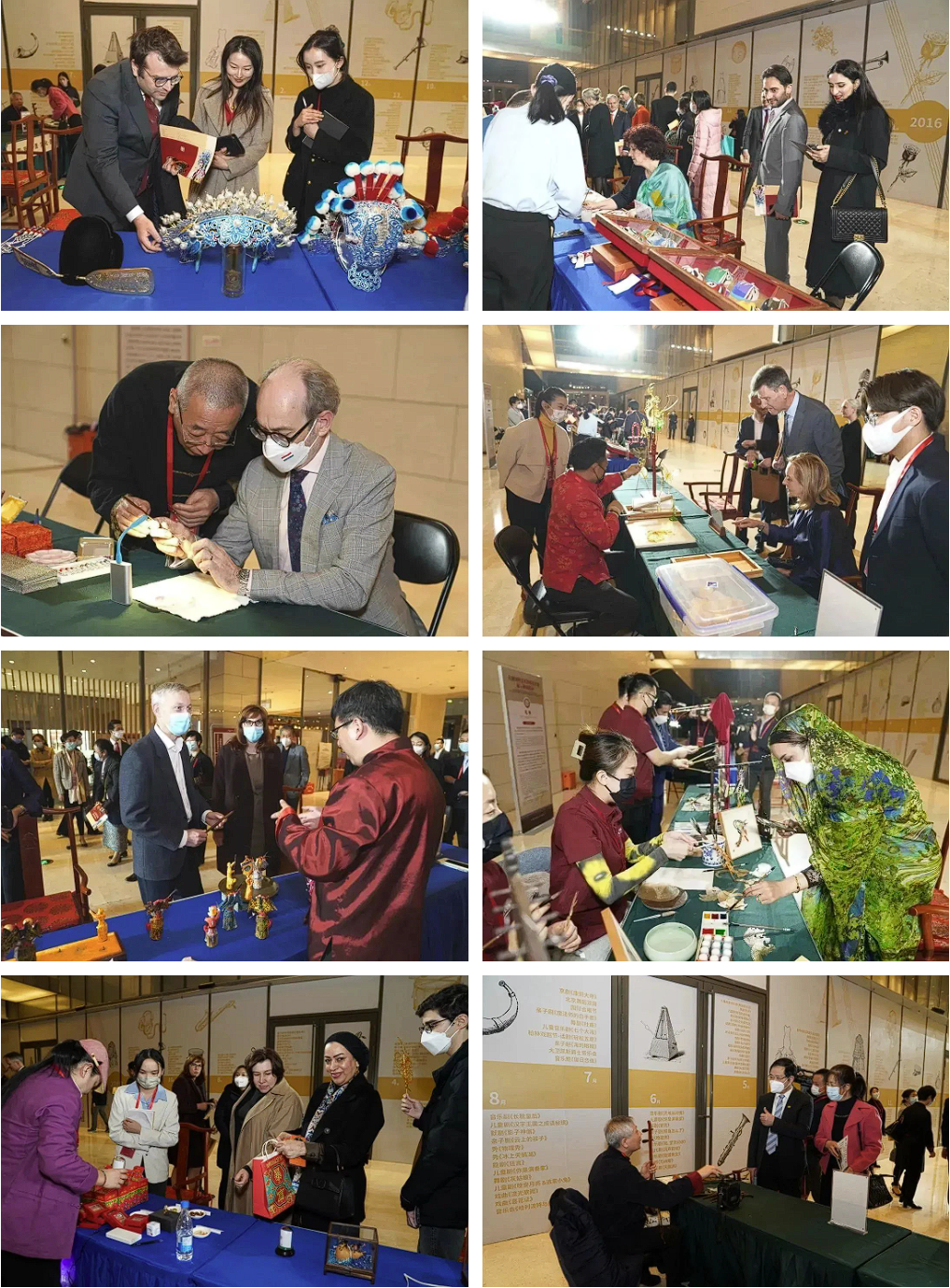 遴選“戲曲盔頭”、“彩塑臉譜”、“內畫鼻煙壺”、“京胡制作”等8個與戲曲藝術相關的非遺項目現場展示?,F場,非遺傳承人進行了認真細致的講解,駐華使節們興趣濃厚,不時提問,詳細了解原材料、制作工藝等問題,有些還饒有興致地拿起畫筆,現場勾勒起京劇臉譜。